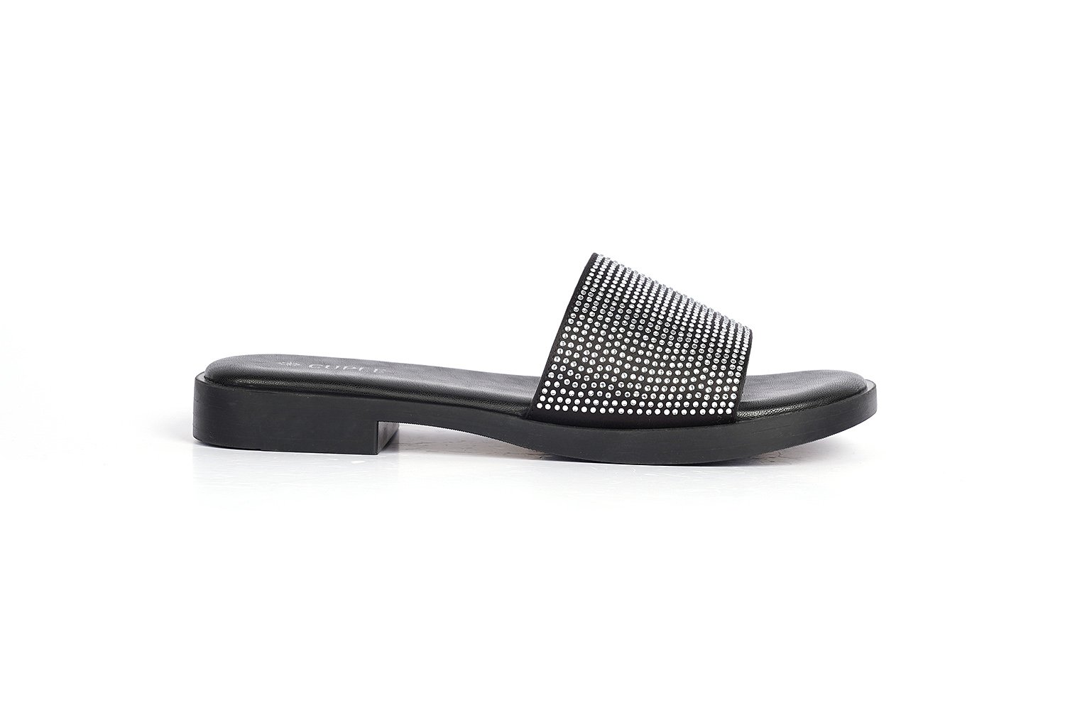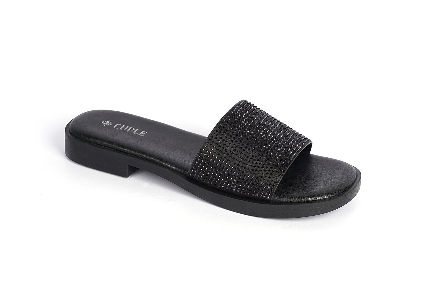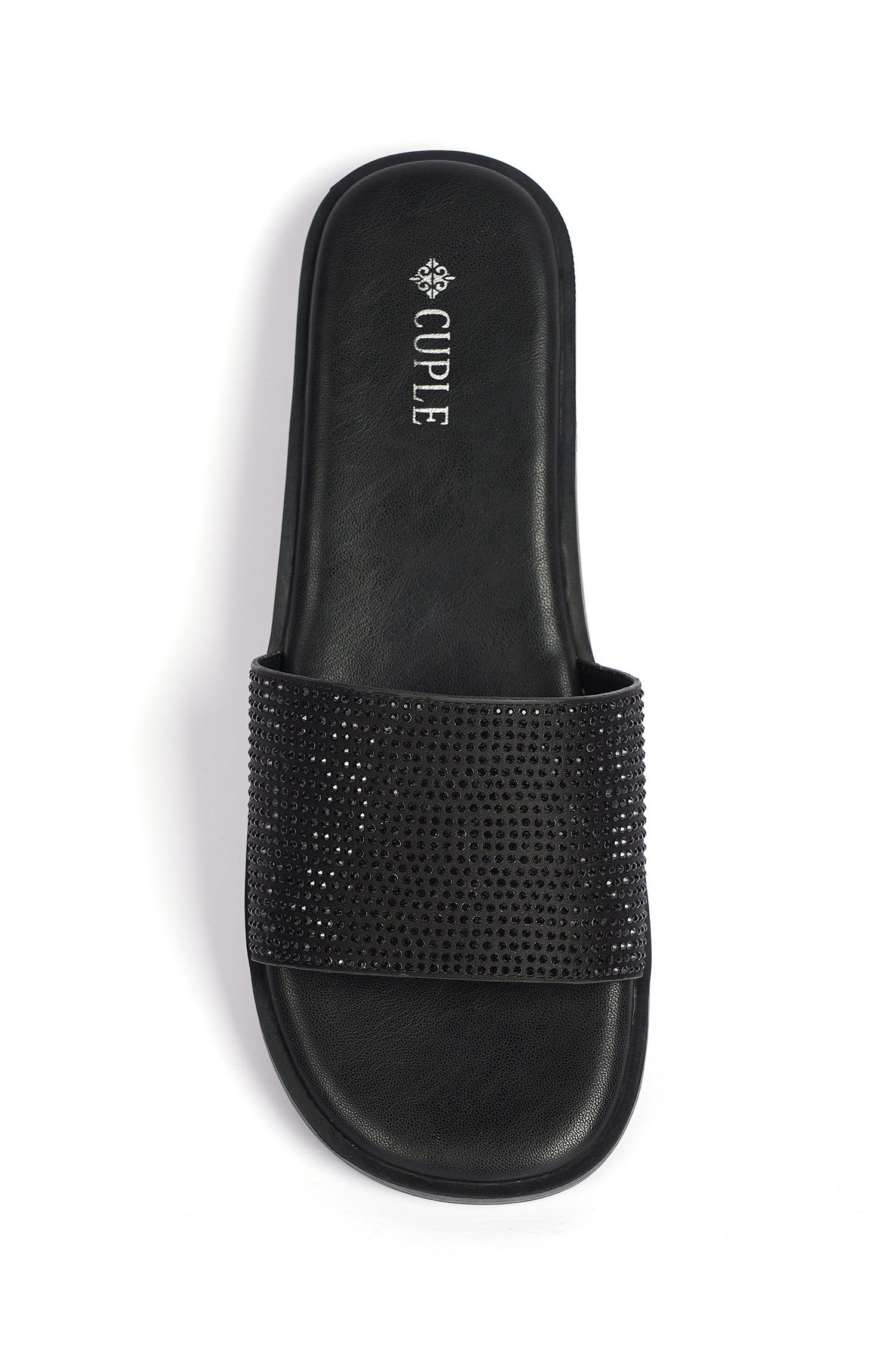 Add some sparkle to your look with these black slide flats featuring subtle glitter accents for a glamorous touch.