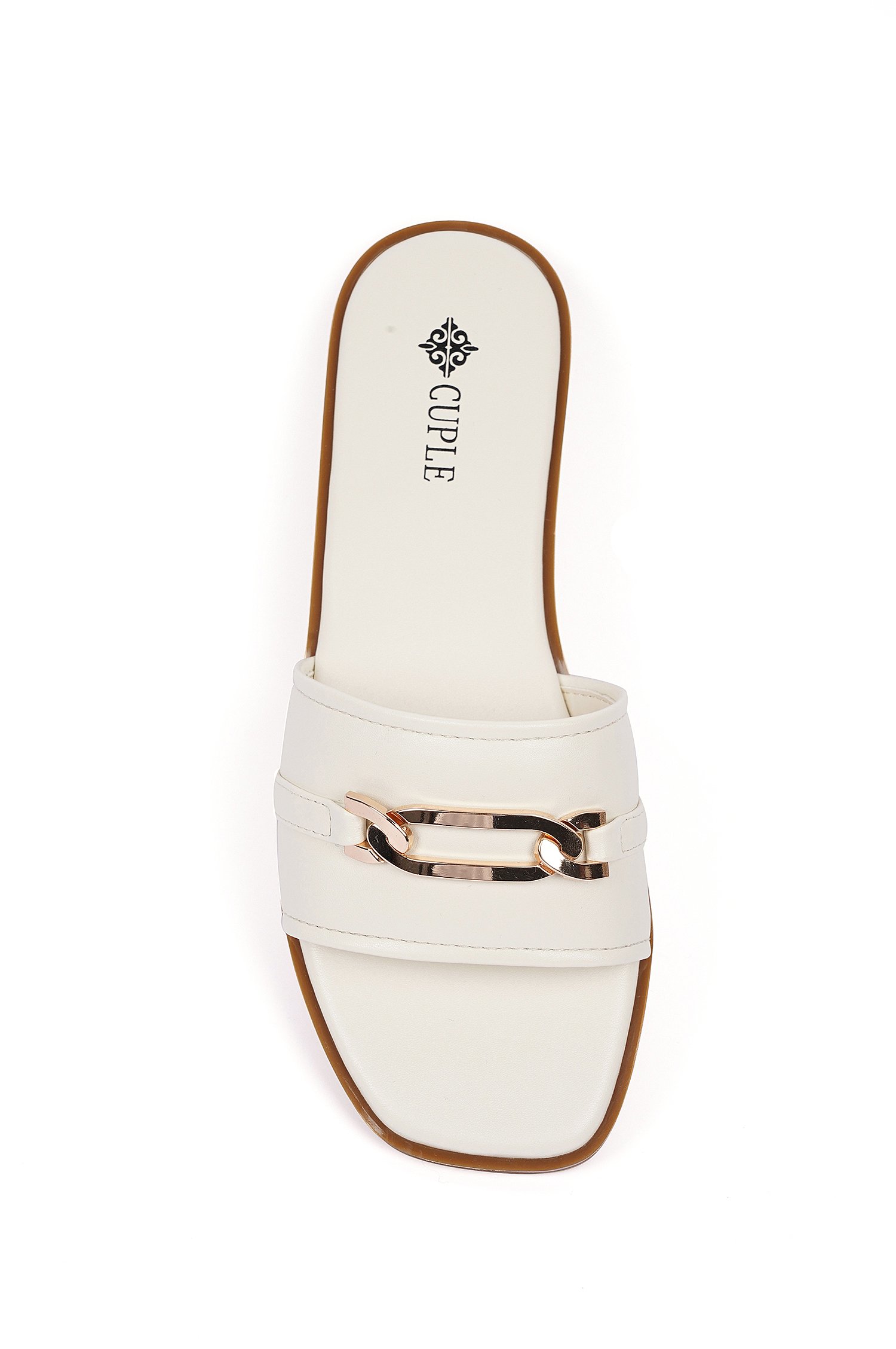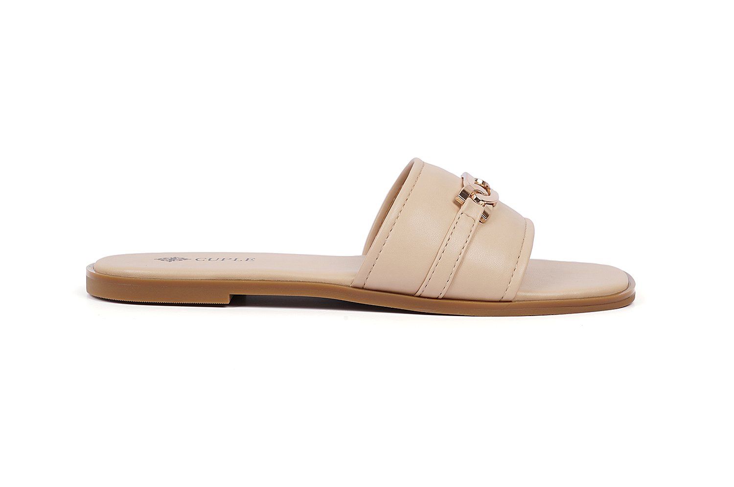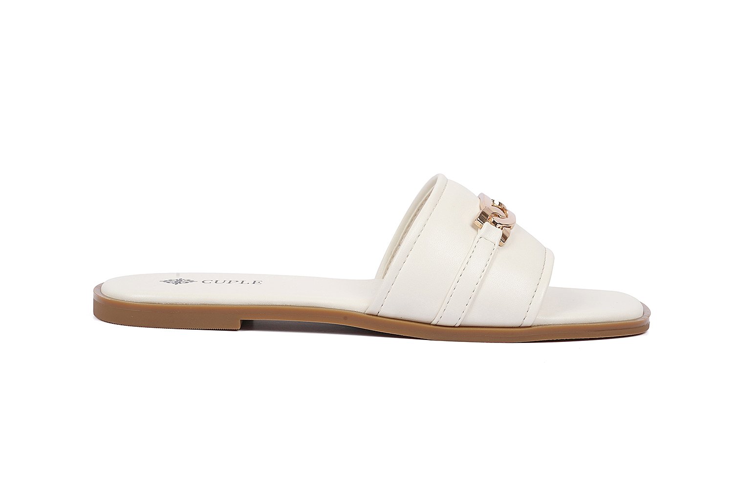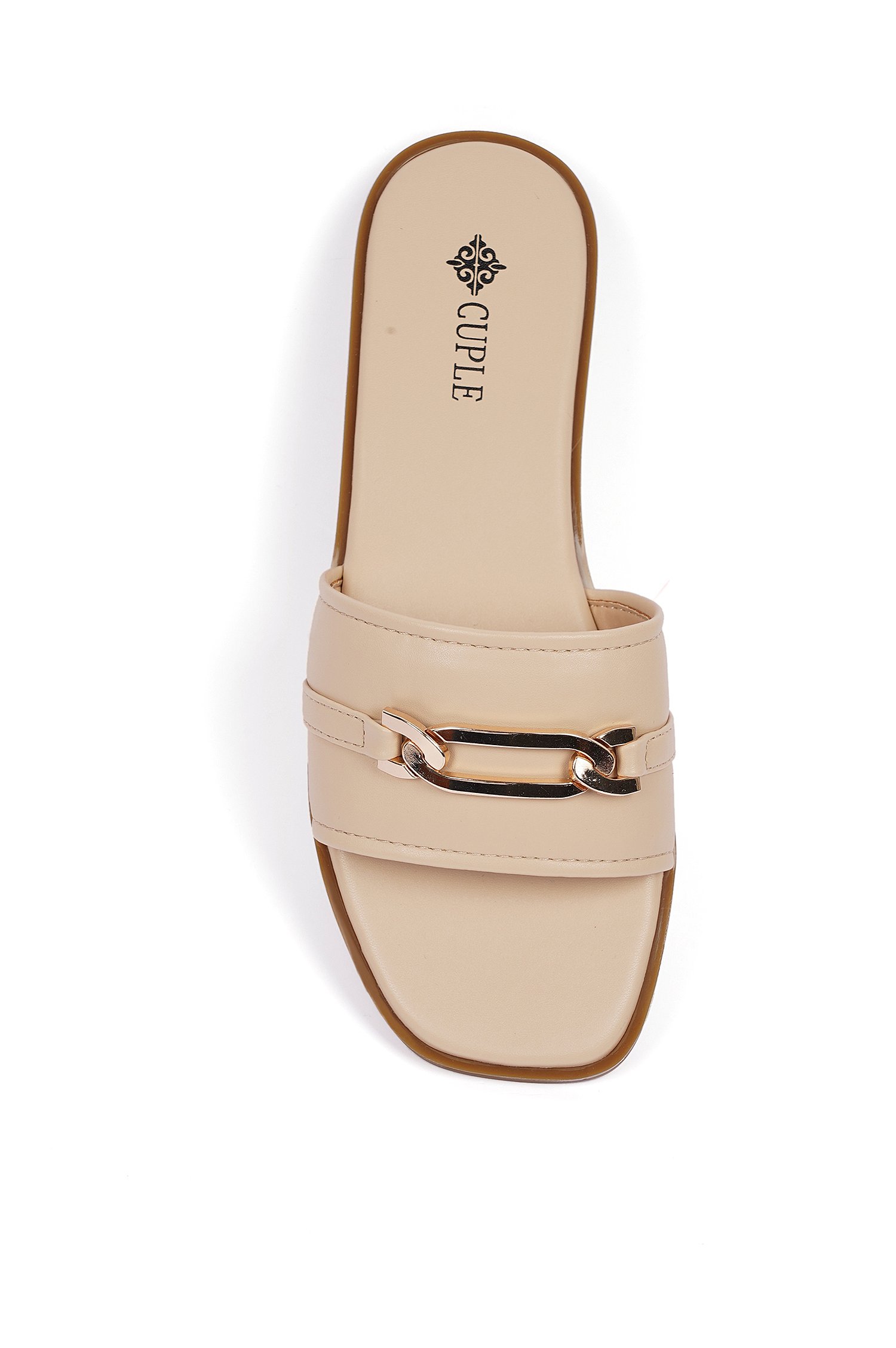 These metallic silver slide flats offer stylish strap details and a luxurious finish.