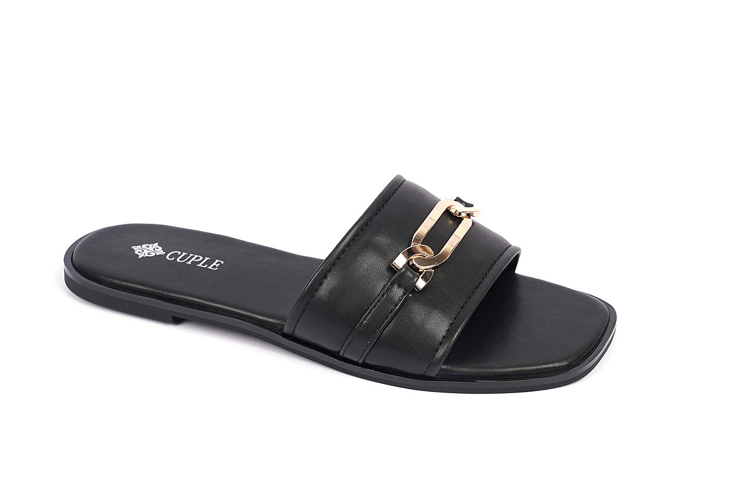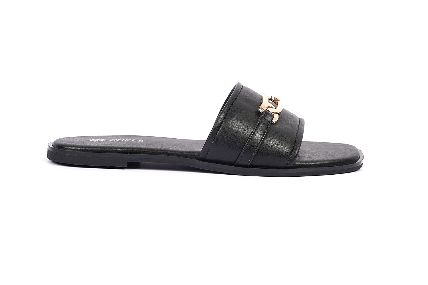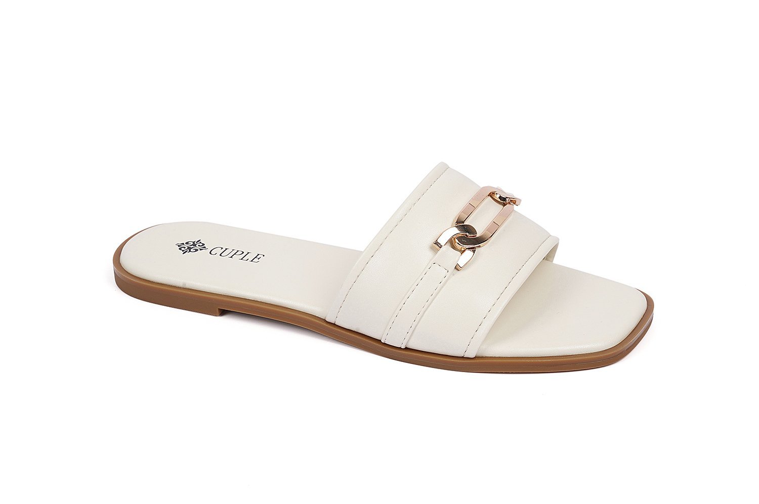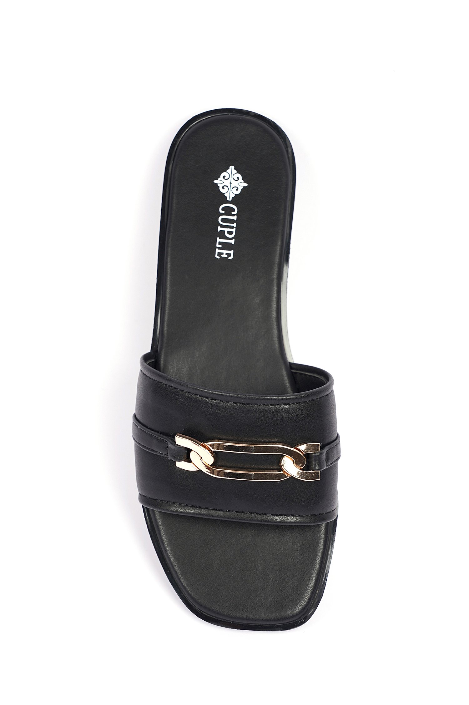 These metallic silver slide flats offer stylish strap details and a luxurious finish.