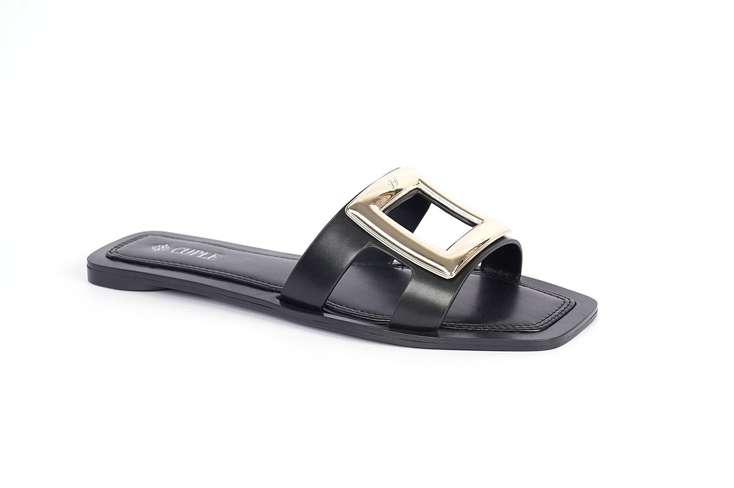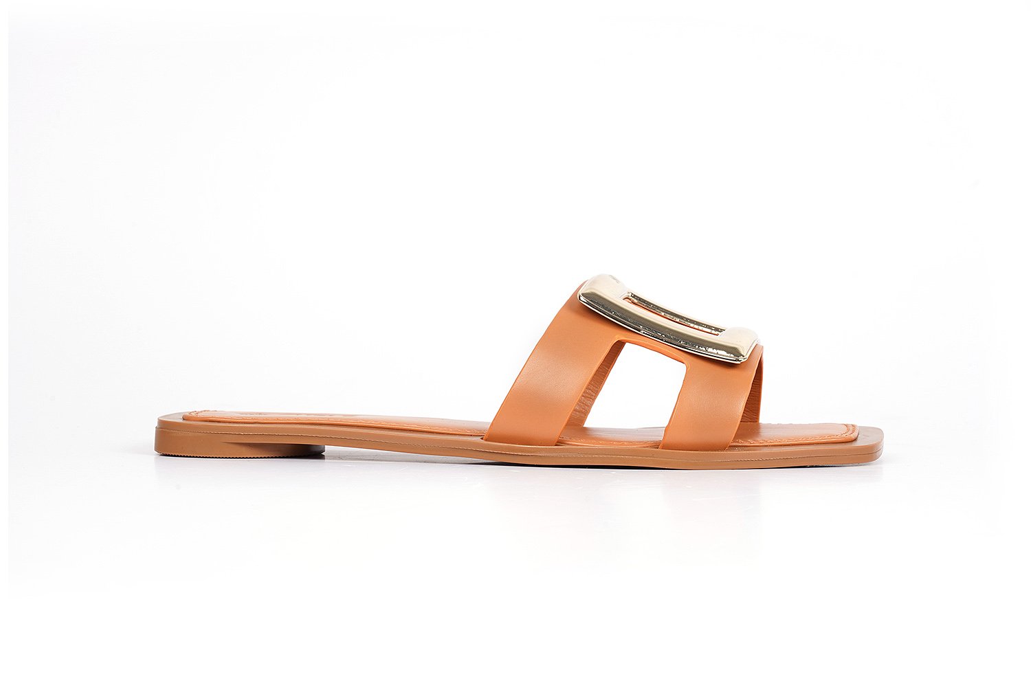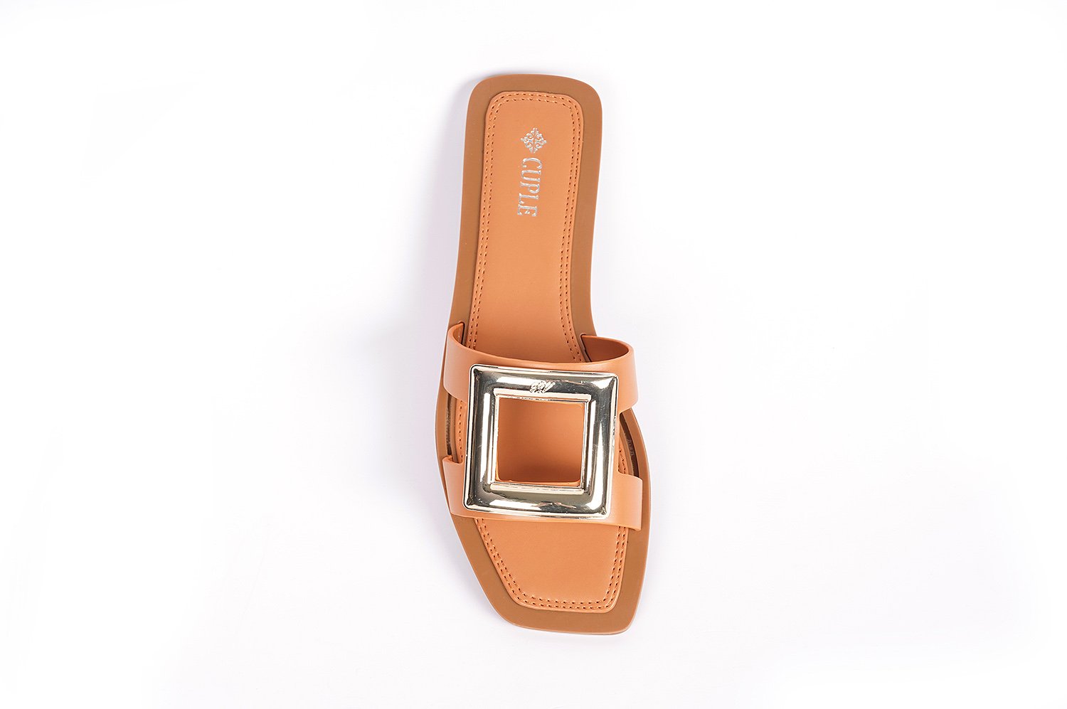 Step out in sleek style with these brown slide flats featuring a bold gold buckle detail.