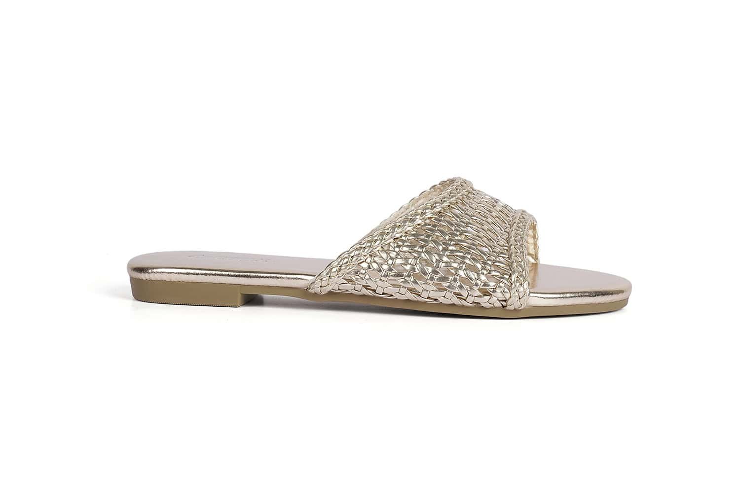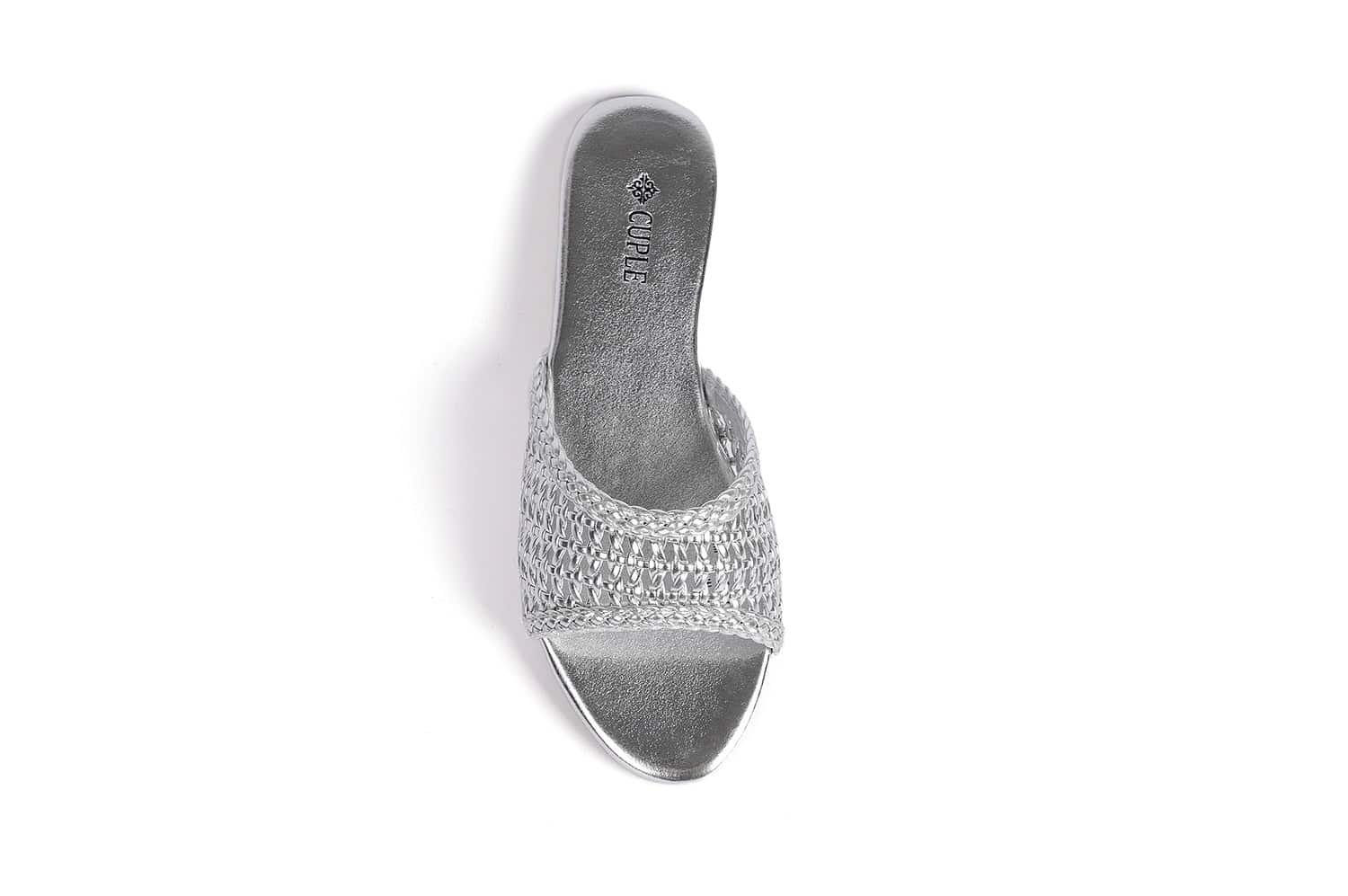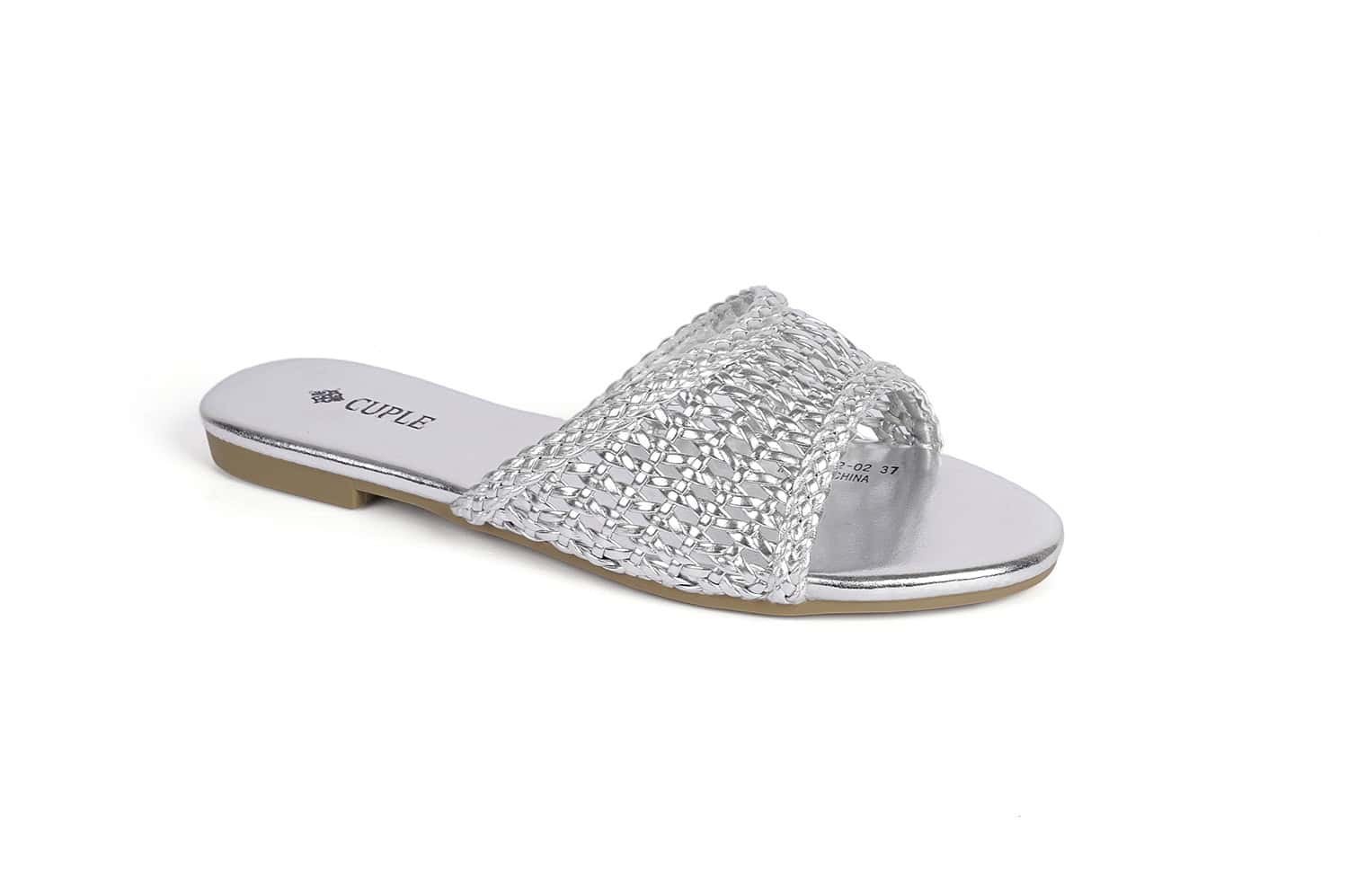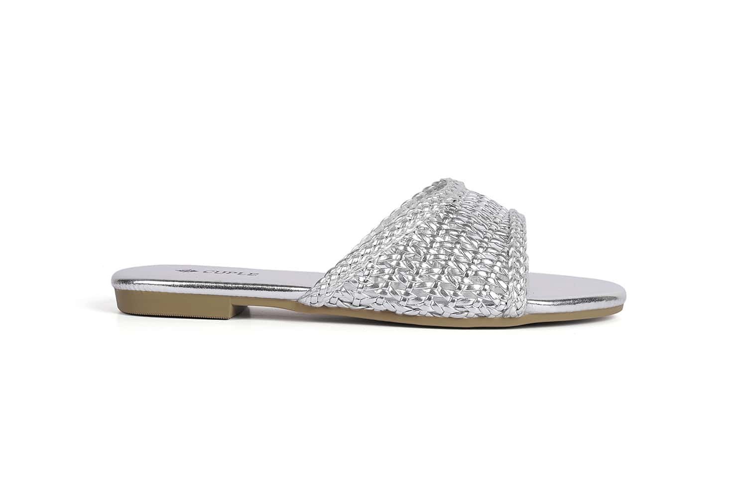 Step out in style with these unique silver slide flats featuring a luxurious design and sparkling details.